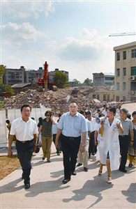 17日考察的各個(gè)地點(diǎn)災(zāi)情嚴(yán)重,魏城鎮(zhèn)鎮(zhèn)長傅文東表示,地震發(fā)生至今已3個(gè)多月,該鎮(zhèn)大多受災(zāi)群眾生活基本已回復(fù)正常,老百姓都遷入了活動板間房,生活設(shè)施如水、電、電視等也已全部接通,輔助設(shè)施正加緊興建,災(zāi)后重建工作已全面展開。目前該鎮(zhèn)7000多農(nóng)戶有重建住房的需要,政府現(xiàn)正積極籌集資金、物資及施工人員,讓老百姓可以在原地重建家園。