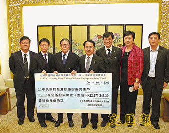 日前港協(xié)暨奧委會(huì)會(huì)長(zhǎng)霍震霆、副會(huì)長(zhǎng)余國(guó)梁、義務(wù)秘書長(zhǎng)彭沖及義務(wù)副秘書長(zhǎng)王敏超,攜同捐款支票到中聯(lián)辦,由中聯(lián)辦副秘書長(zhǎng)王志民、宣傳文體部副部長(zhǎng)陳亞瓊及李冰接受,將全數(shù)捐款轉(zhuǎn)交“中央政府駐港聯(lián)絡(luò)辦賑災(zāi)專戶”,幫助四川災(zāi)區(qū)人民。
