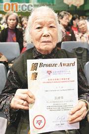 獲頒銅章的張婆婆在天平長者宿舍住了十一年,除媳婦居港外,其它親人都長居英國。她于七年前主動為院舍當義工減輕工作人員的工作量,如今雖行動不便,但仍擔任探訪院友登記一職,禮貌地邀請?zhí)皆L人士登記,以防閑雜人等出入院舍范圍。張婆婆盡責地保護院舍安全,她稱當義工令她精神更健康。