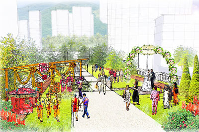 “姻園”的設(shè)計和布置都圍繞婚嫁這一主調(diào),并提供約30,000平方呎凈樓面的零售用地。除了喜帖店鋪,該處還提供與婚嫁有關(guān)的商品和服務(wù),包括婚紗、禮服、鮮花、禮餅、發(fā)型屋、珠寶首飾、影樓、房車租賃、婚宴舞會統(tǒng)籌服務(wù),以及場地布置等。毗連“姻園”的部分空地也有切合婚嫁主題的裝飾布置和藝術(shù)雕塑品擺設(shè)。