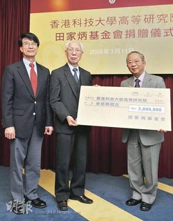 據(jù)香港媒體報(bào)道,田家炳基金會(huì)捐款300萬元給科大高研院,加上政府的配對(duì)基金,成立600萬元的“田家炳教育基金”;饡(huì)主席田家炳、科大校董會(huì)主席陳祖澤及校長(zhǎng)朱經(jīng)武11日出席了捐贈(zèng)鳴謝儀式。