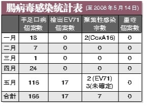 新證實的4宗EV71陽性個案包括:1例為同善堂第二托兒所幼兒;1例為濠江小學二年級學童,其弟為已停托的同善堂第二托兒所的幼兒,較早前亦有皰疹性咽峽炎癥狀;1例為仁伯爵綜合醫(yī)院因其它疾病住院的幼兒,在常規(guī)檢查中發(fā)現(xiàn),并無腸病毒感染的癥狀,14日已出院;1例為未入學或入托的門診病人。