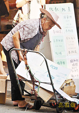 負責調查的浸大社會工作系助理教授李建賢表示,雖然拾荒者仍以長者為主,但發(fā)現(xiàn)天水圍區(qū)的中年拾荒者開始冒起,“現(xiàn)在經濟開始差,失業(yè)率或會上升,新界西北地區(qū)已出現(xiàn)中年拾荒者加入競爭,趕走不少公公婆婆,令長者生活更慘!