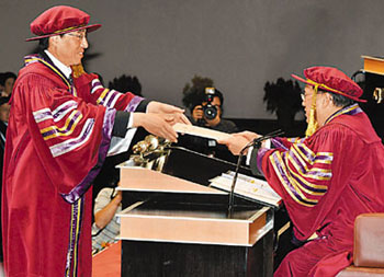 中新網(wǎng)11月12日電 據(jù)香港《文匯報(bào)》報(bào)道,香港城市大學(xué)11日舉行2008年畢業(yè)禮以及新任校長(zhǎng)郭位就職典禮,由城大校監(jiān)、行政長(zhǎng)官曾蔭權(quán)主持。
