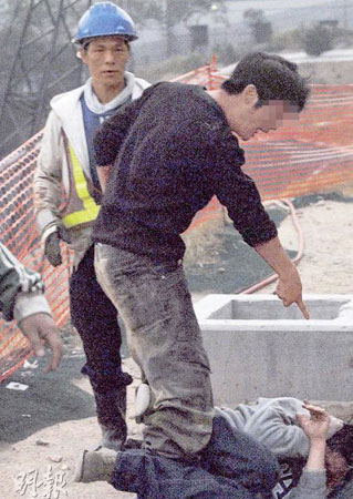 隨即再有3至4名工人把衛(wèi)永康包圍,一名黑色上衣的工人口出狂言:“打死你都得呀!”隨即把衛(wèi)推跌地上,拳打腳毆打逾一分鐘,衛(wèi)永康只能雙手抱頭、蜷曲身體自我保護,站在高處的其他記者目睹事件隨即大聲喝止,更有電視臺記者把毆打經(jīng)過拍下。