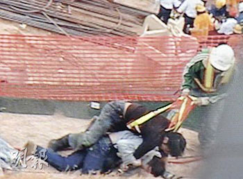 工友其后上前勸止及拉開逞兇者,衛(wèi)永康不欲被兇徒逃去,負傷企圖抓緊疑人雙腳,但不成功,兇徒再掙開工友,再向衛(wèi)連環(huán)出拳及起腳襲擊其頭部及身體,衛(wèi)永康被毆至?xí)炟。調(diào)查工傷的警員見狀趕至才控制場面,警員調(diào)查后,把涉嫌傷人的李某拘捕帶署,但并沒有帶走涉“叉頸”的工人,衛(wèi)永康則由救護車送院救治。