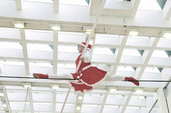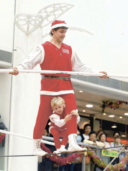 據(jù)香港明報報道,一行8人的衛(wèi)氏家族成員,昨(6日)于香港大埔商場作高空表演。在半小時表演內(nèi),衛(wèi)氏家族成員粉墨登場,一家大小扮成圣誕老人。帶領家族成員的Peter Mario,先以一個“筋斗”給觀眾一個見面禮,再來一招“倒豎”,這些動作看似簡單,但卻是在高空13米、離地近兩層樓高的鋼在線進行。