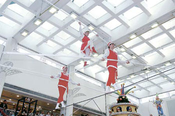 25歲的Jasmine是Peter的女兒,昨天她表演在鋼在線推手推車,走過10多米的距離。樣貌標(biāo)致的Jasmine,一面手執(zhí)平衡桿,面帶笑容走過腳下的幼絲,臺(tái)下的觀眾卻為她“一步一驚心”。Jasmine說,她曾試過離開表演事業(yè),在外另覓工作,但始終心系腳下這條鋼線!笆冀K一家人 能一起工作,獲得安全感和快樂,是外面找不到的,而且我熱愛演出!(周淑蘭)