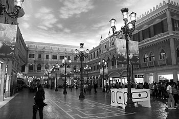 于2007年8月開業(yè)的威尼斯人度假村酒店,占地150萬平方米,融名店、娛樂、酒店等于一體,客房達3000間,另設12萬平方米的會議展覽場地、座位達1.5萬個的表演場地、10萬方平米的購物中心以及5.4萬平方米的博彩場地。