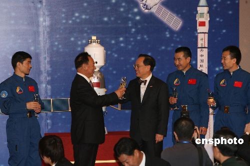 十二月五日晚,香港特區(qū)政府在香港會議展覽中心舉行晚宴,歡迎“神舟七號”載人航天飛行代表團(tuán)一行。中新社發(fā) 武仲林 攝