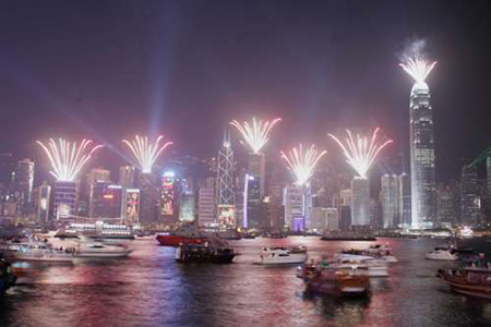 二十三時(shí)五十九分,行政長(zhǎng)官曾蔭權(quán)在尖沙嘴文化中心啟動(dòng)倒計(jì)時(shí)儀式。二00七年的最后二十秒,國(guó)金二期北面外墻兩側(cè)由三十二層起依次向上燃放焰火,火樹(shù)銀花照耀整個(gè)維港;合和中心、AIG大廈、長(zhǎng)江集團(tuán)中心及東企業(yè)廣場(chǎng)四棟大廈,外墻同時(shí)顯示倒計(jì)時(shí)時(shí)間,停泊在維港的滅火輪則向海面噴射多樣的水花……