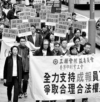 據(jù)香港文匯報報道,23日早約30名《成報》前員工由中環(huán)遮打花園出發(fā),一邊高叫口號,一邊游行到政府合署的律政司司長辦公室,要求律政司酌情發(fā)出禁制令禁止《成報》出版。其后獲律政司政務專員何淑兒代表接收請愿信,以及商討解決方法。