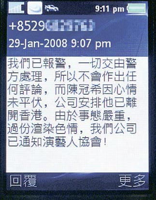 據(jù)了解,部分裸照可能源于一部已遺失或曾交予他人修理的手提電腦,不過,事件關(guān)鍵人物陳冠希,其經(jīng)理人29日通過手機短訊回應(yīng)傳媒時指出,由于陳冠希心情未平復(fù),公司安排他離開香港。
