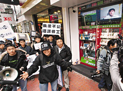 網(wǎng)民沿途高叫口號及展示標語,游行人士途經(jīng)一間店鋪時,店外電視正在播出早前陳冠希的道歉錄像,隨即惹來網(wǎng)民起哄,大呼“選擇性執(zhí)法可恥”等口號。