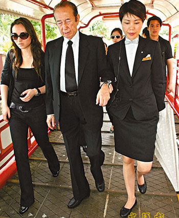 賭王由大女兒何超云扶著離開(kāi),全程未發(fā)過(guò)一言,上車(chē)前更以手揩眼睛,神情哀傷,兒女何超蓮及何猷啟隨賭王身后步出,陪著父母往賭王旗下的香港仔珍寶海鮮舫吃解穢酒。