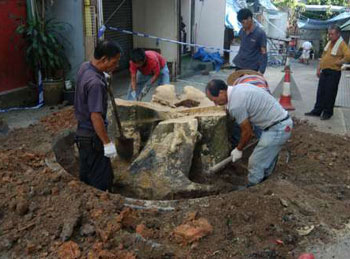由于樹干直徑粗近兩尺,工人要鋸成片狀,再寫上編號運(yùn)走,等待日后重組樹型追查被侵蝕和倒塌原因。部分樹干的中央位置被蟲蛀出現(xiàn)“空心”,大量類似螞蟻的昆蟲因巢穴被毀爬行而出。
