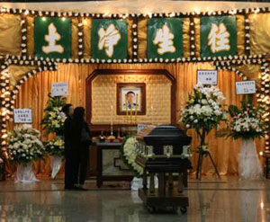 靈堂設(shè)于世界殯儀館一樓世界堂,布置莊嚴(yán)肅穆,靈堂正上方懸掛著“往生凈土”的橫幅,兩旁是“浩氣長存、哲人其萎”的挽聯(lián),下方擺放了蘇志豪生前的軍裝遺像,兩旁擺放著親屬敬獻(xiàn)的花籃,靈堂四周圍著白布,擺滿各界人士敬獻(xiàn)的花圈,兩輛紙扎警隊電單車放在靈堂旁邊。
