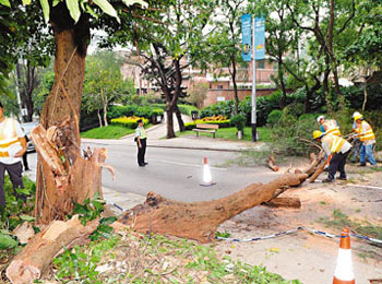 中新網(wǎng)9月3日電 據(jù)香港文匯報(bào)報(bào)道,香港赤柱繼上周三發(fā)生百年古樹砸死19歲香港大學(xué)女生莊頌賢后,附近赤柱村道2日也出現(xiàn)另一棵呈V形生長(zhǎng)逾60年樹齡老樹,也因被侵蝕過度有半邊大樹倒下,幸好沒有造成傷亡。