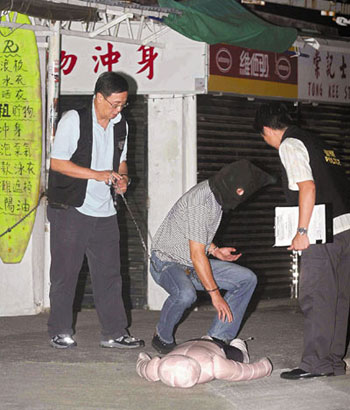 晚上7時45分,另一名身高穿灰黑色間條T恤及牛仔褲、身高約6尺的疑犯,也被重案組探員以黑頭套蒙頭,及帶同一個假人押回現(xiàn)場,在案發(fā)小店對面空地重組案情。其間疑犯曾以拳頭向假人作襲擊狀,探員則在旁錄像,一行人逗留約半小時才離去。