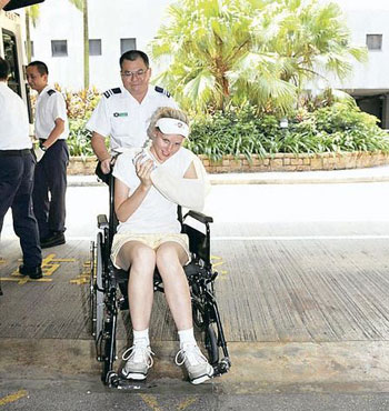 外籍婦人爬山時(shí)被6寸長啡色蜘蛛咬傷左掌背,送院治理時(shí)仍面露微笑,傷勢并無大礙。(圖片來源:明報(bào))