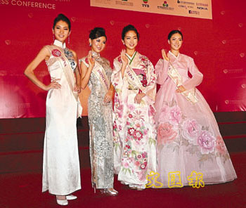 來自世界各地的63位佳麗身穿代表地區(qū)的民族服出場,分組讓傳媒拍照。28日以身穿大露背晚裝的意大利小姐最為性感,去年的國際小姐冠軍墨西哥小姐28日也有出席記者會(huì),但卻失儀露底走光。
