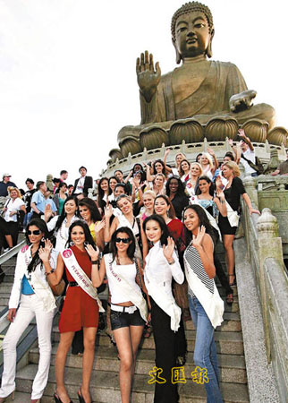 來自世界各地的國際小姐候選佳麗,30日暢游寶蓮寺,在天壇大佛前留影。(圖片來源:文匯報)