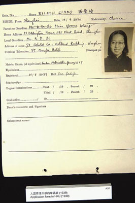 這次展覽的多數展品,是由宋以朗先生提供,如有張愛玲親筆簽名的《傾城之戀》等著作以及《談色.戒》初稿!俺醺濉北砺稄垚哿峄貞诋斈昱_灣《中國時報》內署名“域外人”對《色.戒》的批評。是次展覧,香港大學則展示了張愛玲的入學證明,上面附有她戴著圓厚眼鏡的學生照。但上面的出生日期為九月十九日,與后來她申請美國綠卡時所填的九月三十日不同。