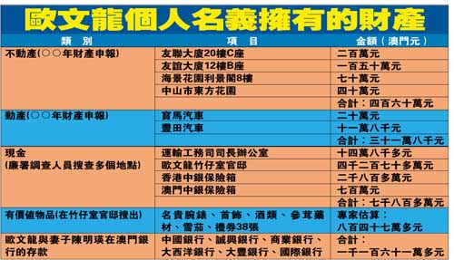 據(jù)澳門日?qǐng)?bào)報(bào)道,澳門廉署首席調(diào)查員馮伯恩經(jīng)法庭批準(zhǔn),透過(guò)計(jì)算機(jī)輔助披露歐文龍以個(gè)人名義及透過(guò)家人擁有的財(cái)產(chǎn)。歐文龍財(cái)產(chǎn)中,主要由動(dòng)產(chǎn)、不動(dòng)產(chǎn)、有價(jià)值物品及澳門銀行存款組成,從物業(yè)登記處數(shù)據(jù)以及廉署在歐文龍司長(zhǎng)辦公室、官邸及銀行保險(xiǎn)箱中搜獲的現(xiàn)金,涉及的款項(xiàng)逾一億元。