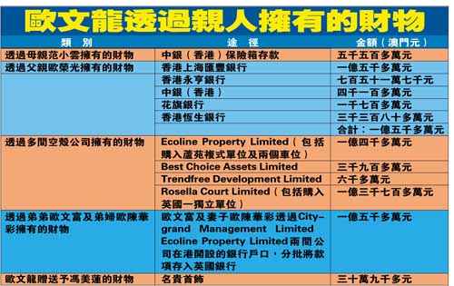 調(diào)查發(fā)現(xiàn),歐文龍透過(guò)其親屬,包括已故的母親范小云、父親歐榮光、弟弟歐文富及弟婦歐陳華彩等在港開(kāi)設(shè)的保險(xiǎn)箱及賬戶,以及所操控的五家空殼公司,轉(zhuǎn)移巨額不法資產(chǎn)。