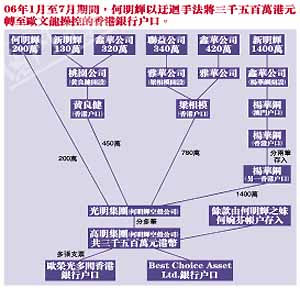 在最初階段,何明輝涉向歐文龍行賄時(shí),一般只是透過(guò)新明輝的二判商、公司職員或何明輝妹妹何婉芬,經(jīng)一兩層清洗后,賄款已去到由歐文龍所操控的香港銀行賬戶內(nèi)。自○五年九至十一月期間,何明輝涉向歐文龍交付一筆三千一百多萬(wàn)港元款項(xiàng)時(shí),過(guò)程開(kāi)始轉(zhuǎn)趨迂回復(fù)雜。何明輝先將賄款轉(zhuǎn)入旗下二判商后,再由新明輝經(jīng)理?xiàng)钊A鋼所開(kāi)設(shè)鑫華公司收集賄款,由楊華鋼本人賬戶多次匯款后,方去到歐文龍操控的Ecoline Property Limited香港銀行賬戶。