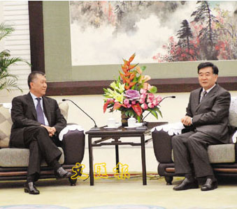 廣東省委書記汪洋會(huì)晤專程到訪的澳門特首何厚鏵。(圖片來源:文匯報(bào))