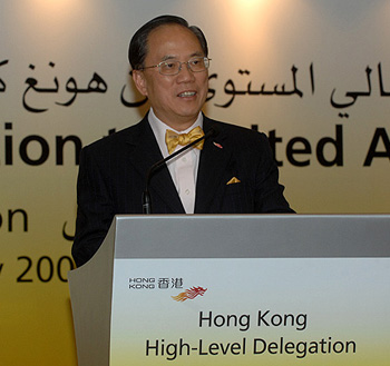 曾蔭權說:“香港一直堅守的基本信念,我們的貿易投資開放政策,以及我們作為環(huán)球金融中心和亞洲地區(qū)轉口港的重要角色,這種種優(yōu)勢結合起來,足可讓企業(yè)穩(wěn)操勝券!彼赋,香港是2008年奧運馬術項目比賽的協(xié)辦城市,并邀請他們蒞臨香港,一起感受奧運精神。