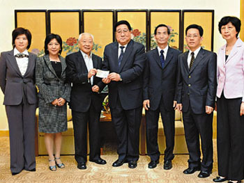 李東;鹩邢薰15日慨捐1000萬,由李東海與兒子李君豪一起遞交了善款支票。 有近8年時(shí)間住在四川的香港知名工業(yè)家蔣震,在兩個(gè)女兒陪同下到中聯(lián)辦捐出1000萬元的支票。