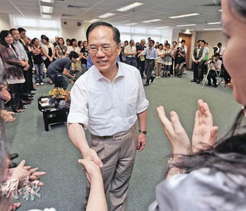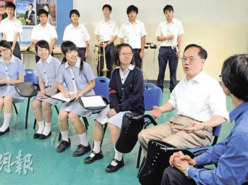 曾蔭權(quán)(右)與家長(zhǎng)及學(xué)生就教育問(wèn)題交換意見。(圖片來(lái)源:明報(bào))