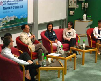 8日在科大就施政報告舉行咨詢會,有近300名學(xué)生進(jìn)場。曾蔭權(quán)表示,希望聽取不同階層的意見,切實(shí)地回應(yīng)市民最關(guān)心的香港的事項(xiàng)。會上不少學(xué)生踴躍發(fā)言,主要關(guān)心民生的議題。