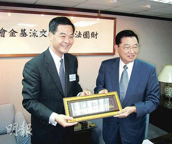 梁振英以香港專業(yè)聯(lián)盟主席身分,率領(lǐng)港交所、貿(mào)發(fā)局、國(guó)際仲裁中心等18名經(jīng)貿(mào)專業(yè)人士組團(tuán)訪臺(tái),23日拜會(huì)“陸委會(huì)”、;鶗(huì)、工業(yè)總會(huì)、商業(yè)總會(huì),由;鶗(huì)董事長(zhǎng)江丙坤、“陸委會(huì)”副主委劉德勛接見。