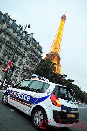 9月28日,巴黎艾菲爾鐵塔再受“詐”彈威脅,警車(chē)在附近戒備。