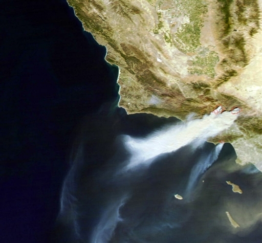 中新網(wǎng)10月23日電 美國(guó)加州近日多處發(fā)生山火,最少有9個(gè)火頭,圣迭戈縣有兩個(gè),以北的海邊豪宅小鎮(zhèn)馬利布則有7個(gè),加州州長(zhǎng)施瓦辛格宣布7個(gè)縣進(jìn)入緊急狀態(tài);痤^逼近民居和一所大學(xué),最少3.6萬(wàn)人須疏散,其中不乏好萊塢明星。山火共計(jì)燒毀了最少3萬(wàn)英畝的土地和39幢房子,1500名消防員參與撲救工作。圣迭戈的火警造成1死,最少17人傷,包括4名消防員。衛(wèi)星拍攝到美國(guó)加州山火十分嚴(yán)重(見(jiàn)圖)。