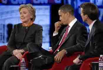 中新網(wǎng)1月22日電 綜合報(bào)道,美國民主黨總統(tǒng)候選人奧巴馬和希拉里-克林頓近日不斷在公開場合互相指責(zé)。1月22日,兩人又在南卡羅來納州就伊拉克及政府開支問題展開激烈爭論,而約翰-愛德華茲則指責(zé)他們的辯論是“爭吵”。