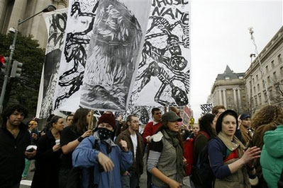 華盛頓的示威者打算“封鎖”國(guó)家稅務(wù)局,另一些示威者則會(huì)設(shè)法阻止K街的“發(fā)戰(zhàn)爭(zhēng)財(cái)者”。K街是華盛頓公司游說(shuō)者的大本營(yíng)。