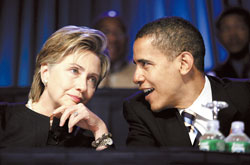 2006年7月19日,奧巴馬與希拉里在華府舉行的一次聯(lián)會席間交談甚歡。