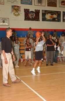 奧巴馬很喜歡打籃球,競(jìng)選活動(dòng)再忙,每隔一段時(shí)間,他還是會(huì)抽空打場(chǎng)籃球賽,這次海外訪問(wèn),他也在阿富汗的美軍基地痛快了一場(chǎng)。