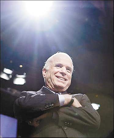 在外交和軍事政策領(lǐng)域的比拼中,古稀之年的麥凱恩顯然要比少年得志的奧巴馬老練得多。出身將門的麥凱恩可謂身經(jīng)百戰(zhàn),其作為戰(zhàn)俘在越南監(jiān)獄中度過5個(gè)春秋的傳奇經(jīng)歷更使其愛國(guó)精神無人能敵。麥凱恩一方面充分利用這些有利條件把自己塑造成美國(guó)民眾足可信賴的政治家和總司令,另一方面持續(xù)攻擊奧巴馬缺乏外交和軍事經(jīng)驗(yàn)的弱點(diǎn)。