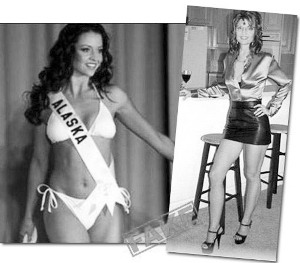 據(jù)稱是佩林參加“阿拉斯加小姐”選美時的比基尼照和一張身著超短裙照片。