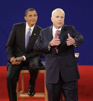 麥凱恩在和奧巴馬交鋒時多次微笑,而當(dāng)他想強調(diào)某些議題時,還降低音量近似耳語。他在奧巴馬講話時有時似乎不知該站在哪里,曾經(jīng)一只手撐在椅子上,身體斜靠著。