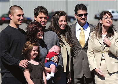 美國(guó)共和黨副總統(tǒng)候選人佩林(右一)和家人在一起的資料照片。