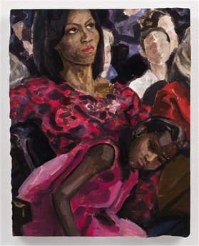 顧名思義,這幅畫是描繪今年8月底民主黨在丹佛舉行全國黨代表大會的情景,顯示年紀(jì)小小的薩莎依偎著母親米歇爾,米歇爾則十分專注地聆聽丈夫奧巴馬在臺上發(fā)表演說,接受民主黨提名角逐總統(tǒng)。