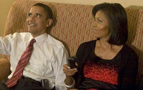 奧巴馬夫婦看電視,夫人控制遙控器