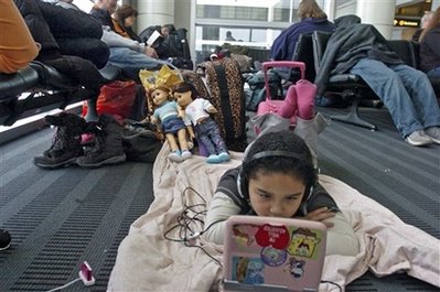 21日,7歲的凡妮莎在西雅圖塔科馬國際機場等待因風雪延誤的班機。