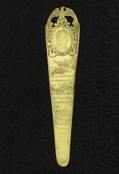 據(jù)稱(chēng),這枚金書(shū)簽具有特殊的歷史價(jià)值,它是希特勒的情人愛(ài)娃1943年送給希特勒的禮物,書(shū)簽上方雕刻著希特勒的臉,此外還有棲息在納粹十字記號(hào)上的鷹圖案,書(shū)簽上的題字還提到了1943年1月31日德軍在斯大林格勒戰(zhàn)敗后向前蘇聯(lián)軍隊(duì)投降的事件,因此,有人認(rèn)為愛(ài)娃送希特勒這枚書(shū)簽是為了安撫希特勒當(dāng)時(shí)沮喪的心情。